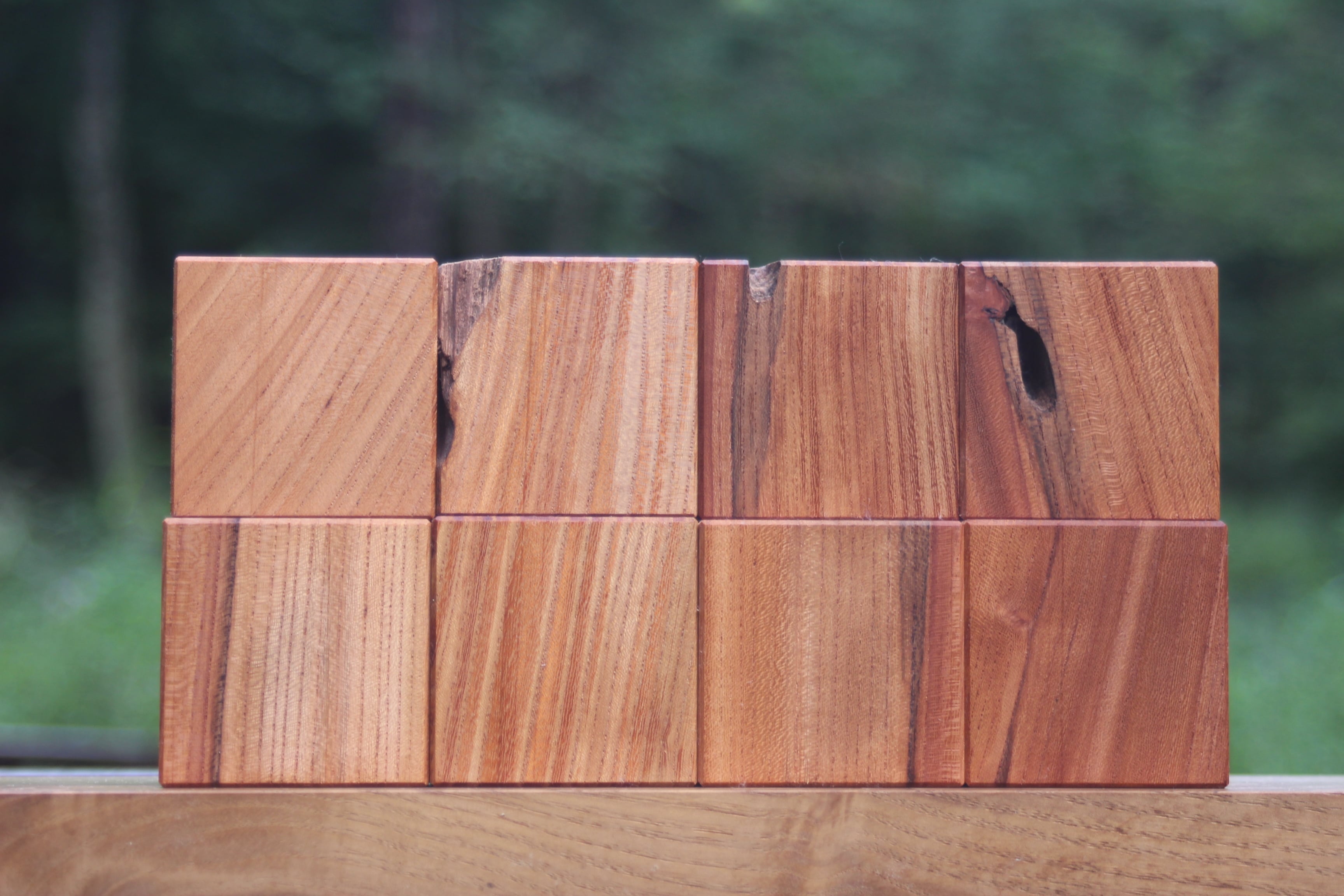 大きさの比較写真をご覧いただけるとわかりますが、真ん中が28mm角、向かって左端が24mm角の大きさです。右端が60mm角のケヤキのキューブ。